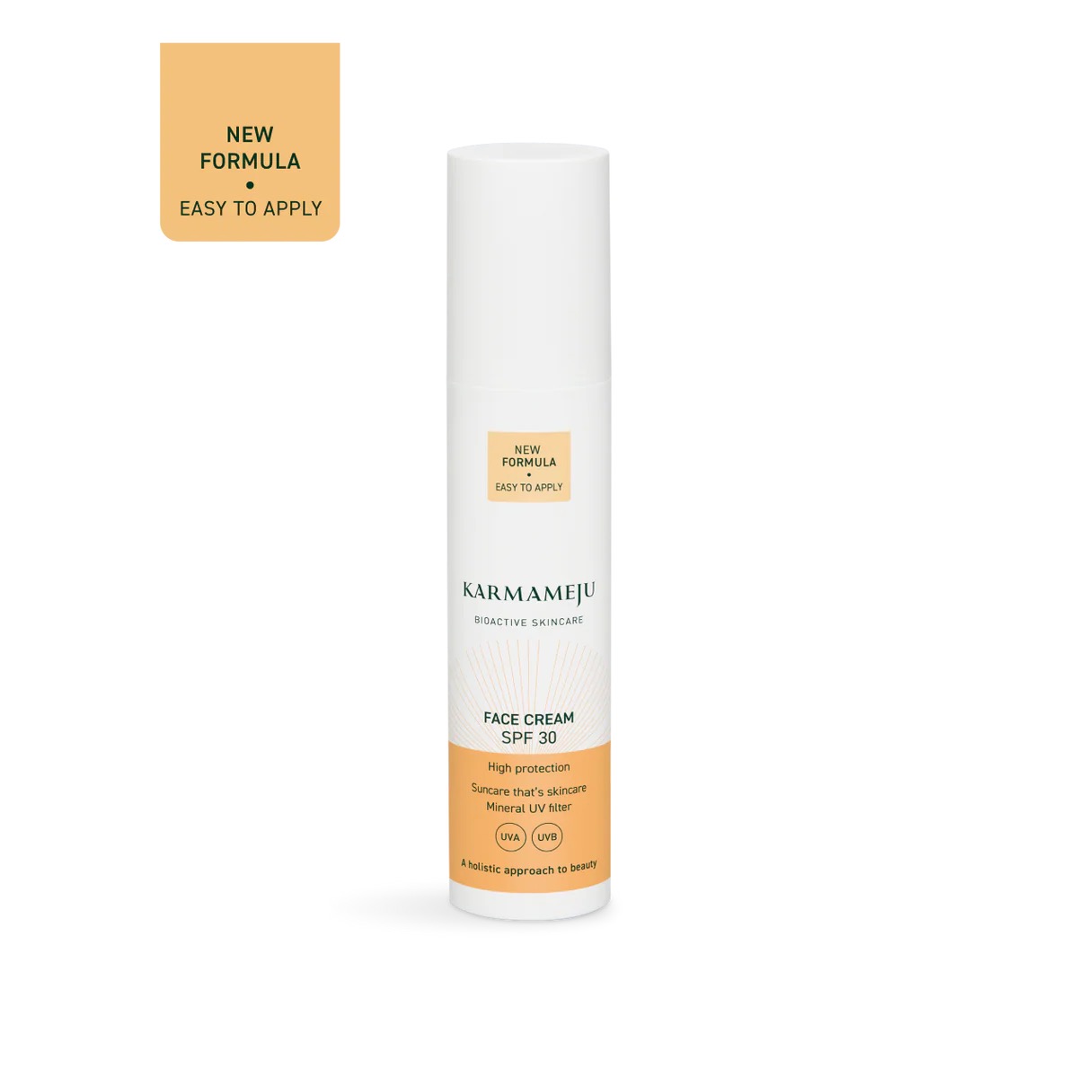 Karmameju Sun Face Cream SPF 30 er en let, antioxidantrig ansigtscreme, der kombinerer daglig fugt og plejende ingredienser med fysisk solbeskyttelse, som reflekterer både UVA- og UVB-stråler uden at føles klæbrig eller hvid på huden.